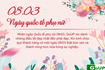 Nhân ngày Quốc tế phụ nữ 08/03, GoUP xin dành những điều tốt đẹp nhất đến phái đẹp. Xin kính chúc quý khách hàng có một ngày 08/03 thật trọn vẹn và thành công hơn nữa trong sự nghiệp.